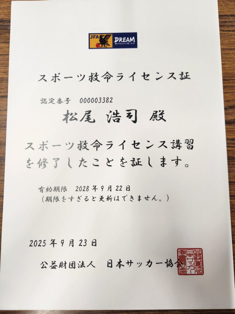 JFA(日本サッカー協会)主催のスポーツ救命ライセンスコースを受講してきました。
