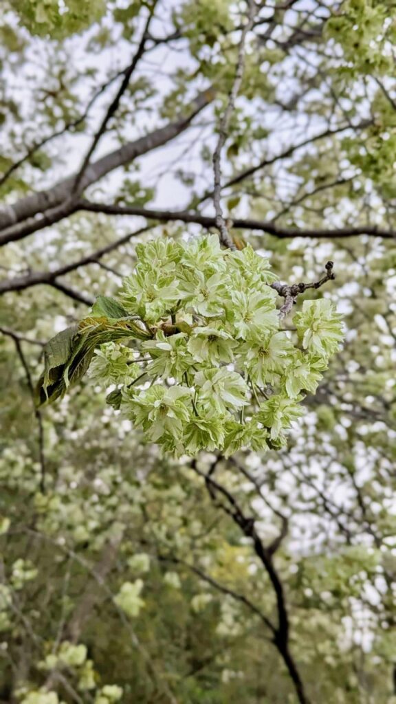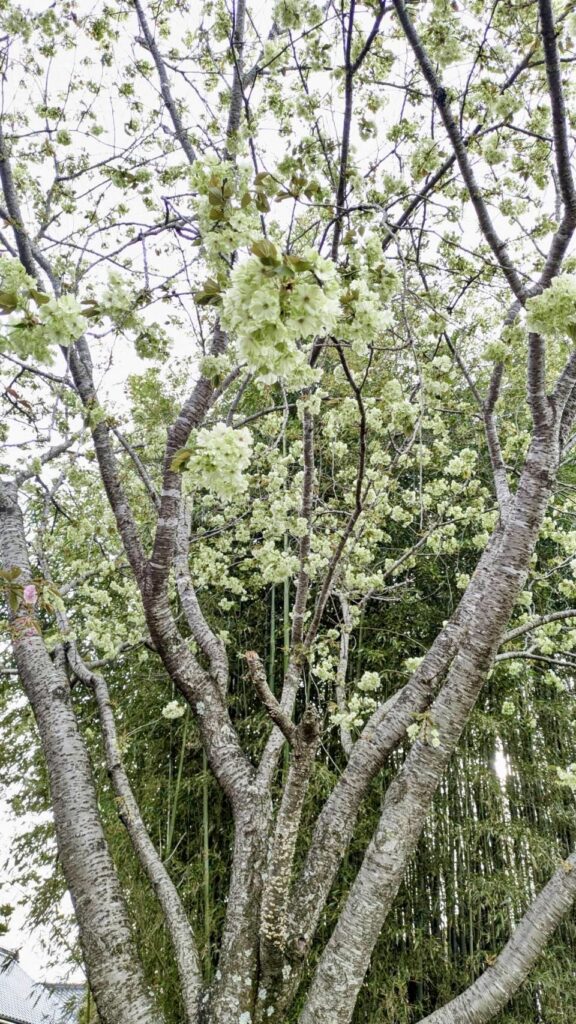一般的なピンク色とは違い、淡い緑色の花を咲かせる珍しい桜です。