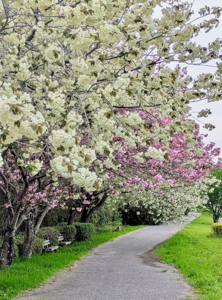 奥のピンクの桜と並ぶと、コントラストが素敵ですね。